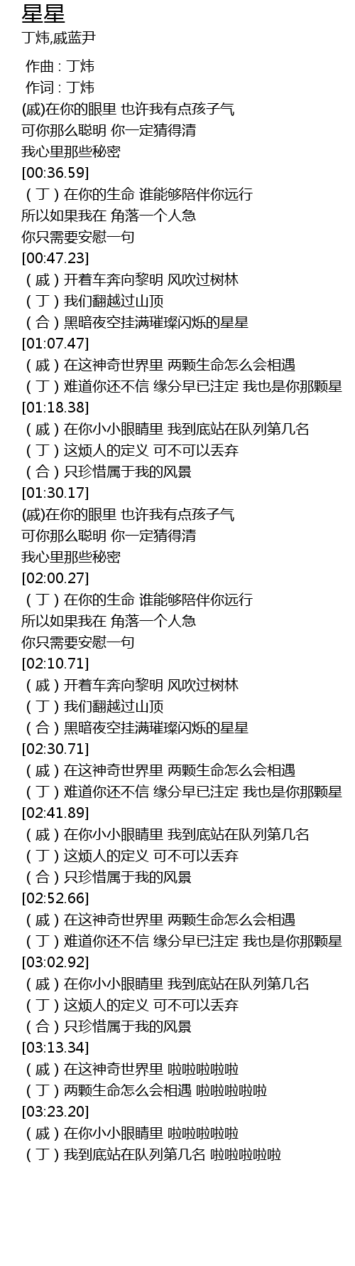 | [02:36.38] | (丁)难道你还不信 缘分早已注定 我也是你那颗星 |