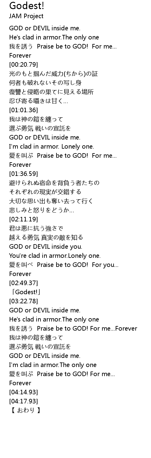 | [03:32.36] | 我を誘う Praise be to GOD! For me...Forever |