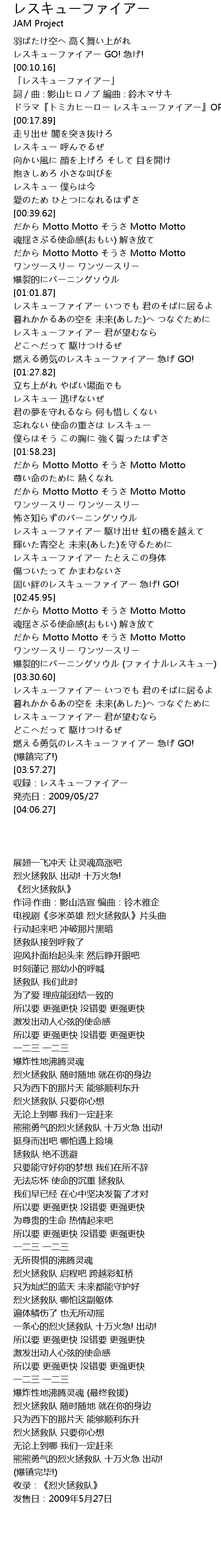 | [02:41.16] | 固い絆のレスキューファイアー 急げ! GO! |