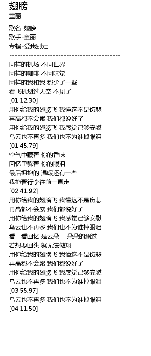 | [01:29.99] | 用你给我的翅膀飞 我感觉己够安慰 |