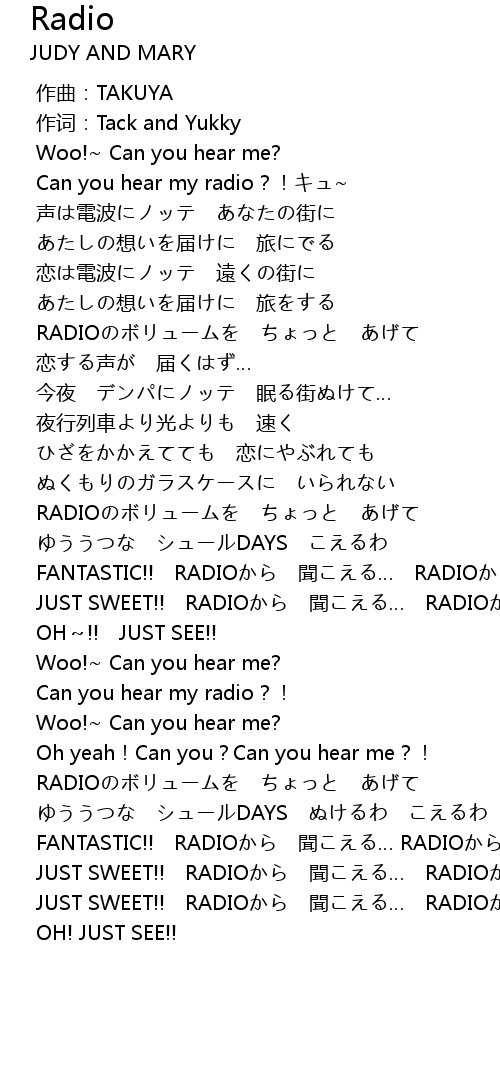 | [01:38.167] | FANTASTIC!! RADIOから 聞こえる… RADIOから… |