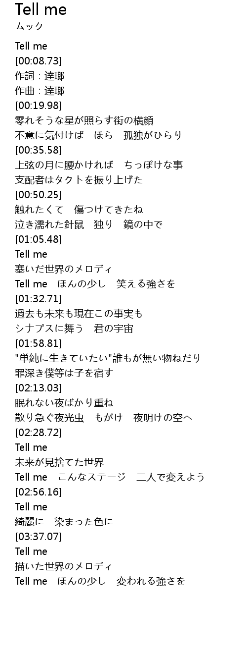 | [00:00.02] | Tell me |