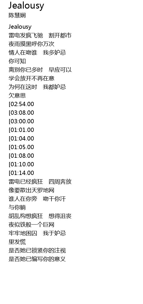 | [03:11.00][03:00.00][02:48.00][02:12.00][00:58.00] | Jealousy... |