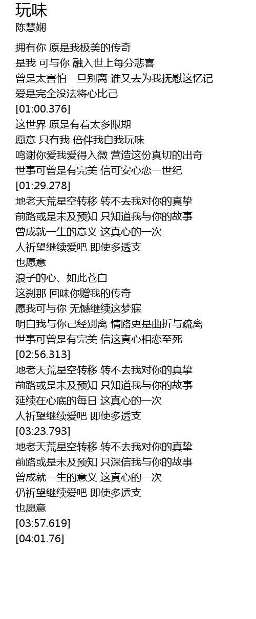 | [01:09.165] | 愿意 只有我 倍伴我自我玩味 |