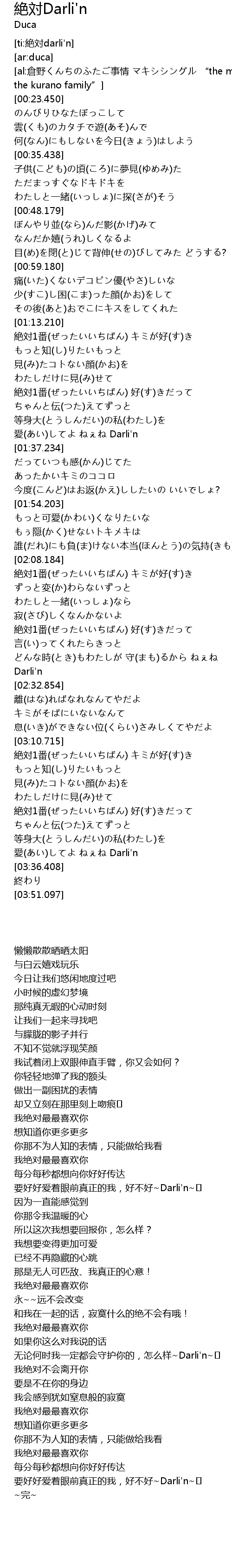 | [02:25.655] | どんな時(とき)もわたしが 守(まも)るから ねぇね Darli'n |