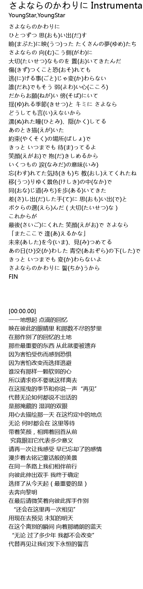 | [02:52.00] | 最後(さいご)にくれた 笑顔(えがお)で さよなら |