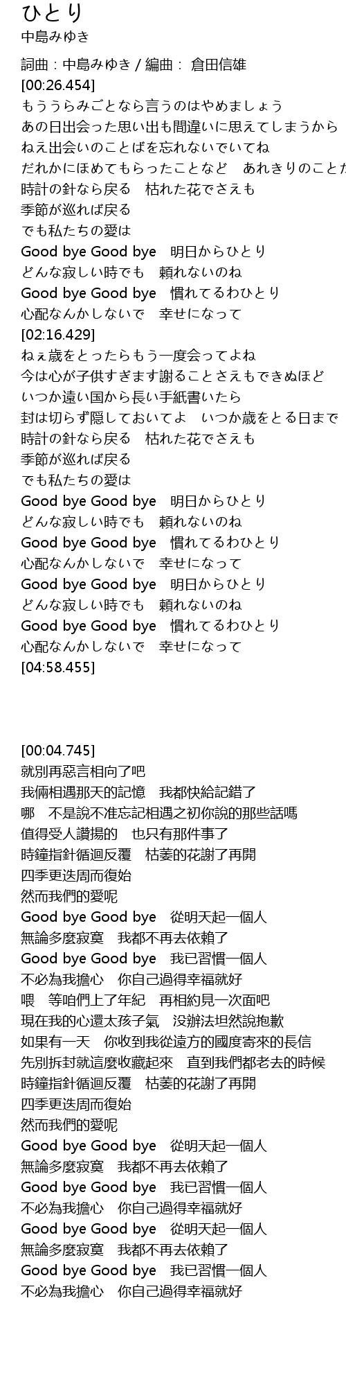 | [04:01.813] | Good bye Good bye 明日からひとり |