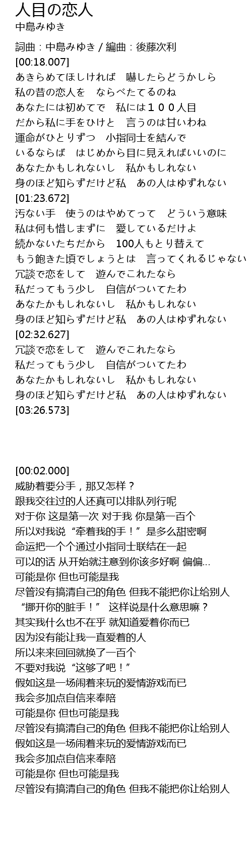 | [00:02.000] | 詞曲:中島みゆき/編曲:後藤次利 |