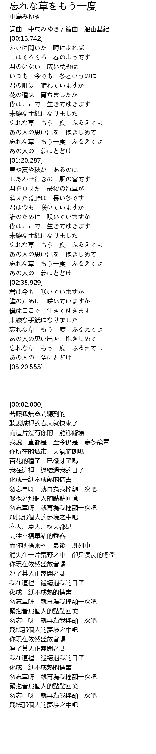 | [02:25.453] | 忘れな草 もう一度 ふるえてよ |
