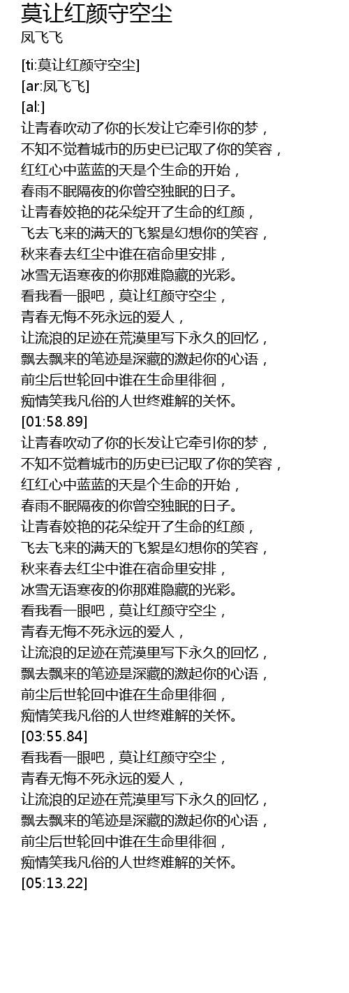 | [01:12.59] | 看我看一眼吧,莫让红颜守空尘, |