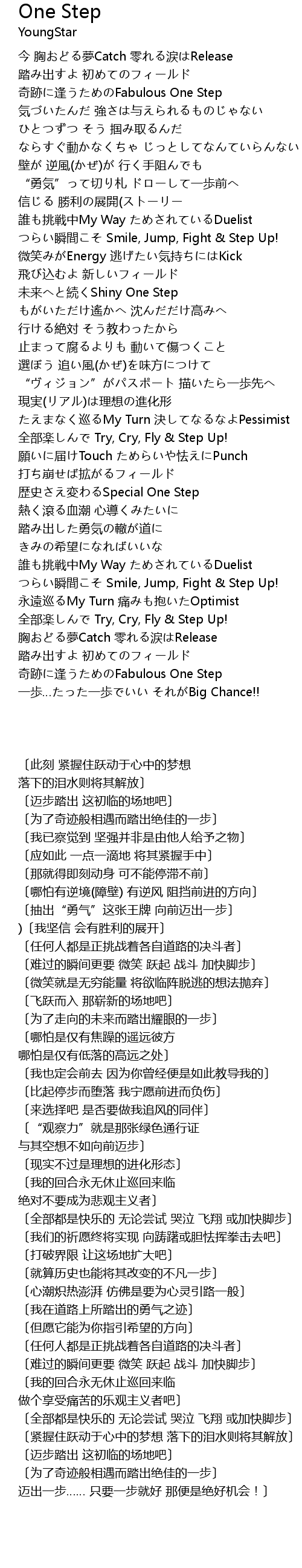 | [03:22.62] | 一歩…たった一歩でいい それがBig Chance!! |