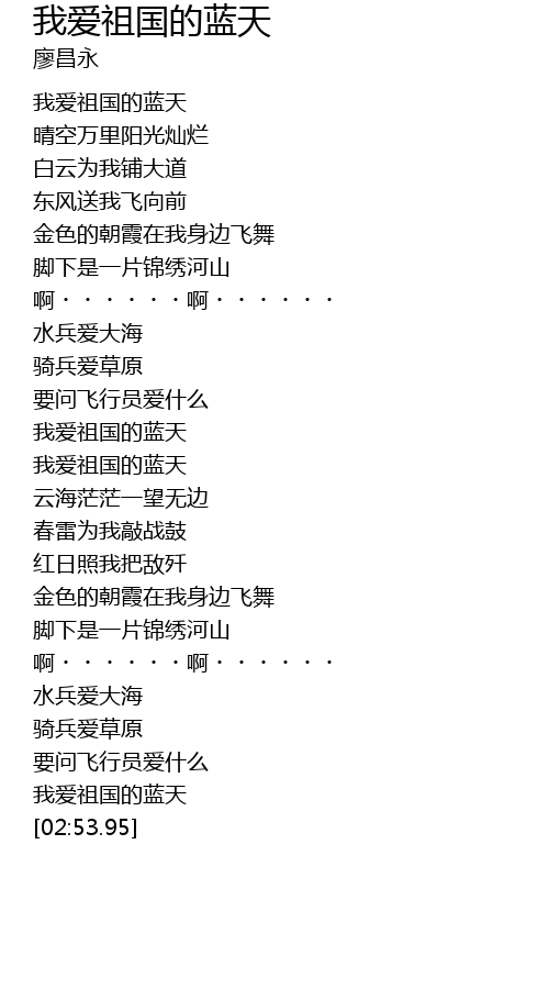 | [02:41.82] | wǒ ài zǔ guó de lán tiān |