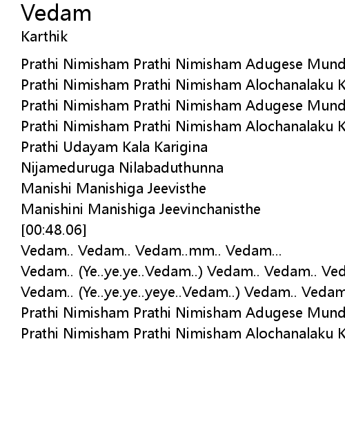 | [00:59.79] | Vedam.. (Ye..ye.ye..Vedam..) Vedam.. Vedam.. Vedam... |