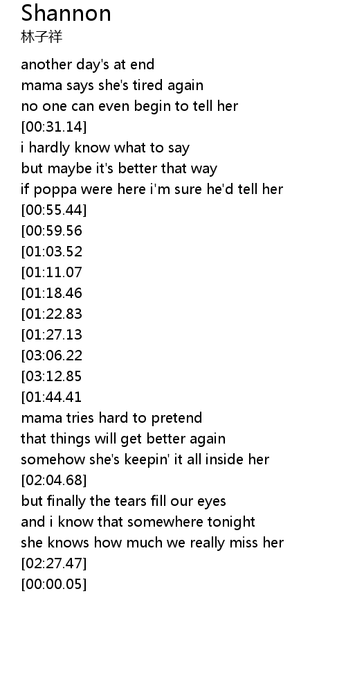 | [02:31.96][00:59.56] | shannon is gone i heard |