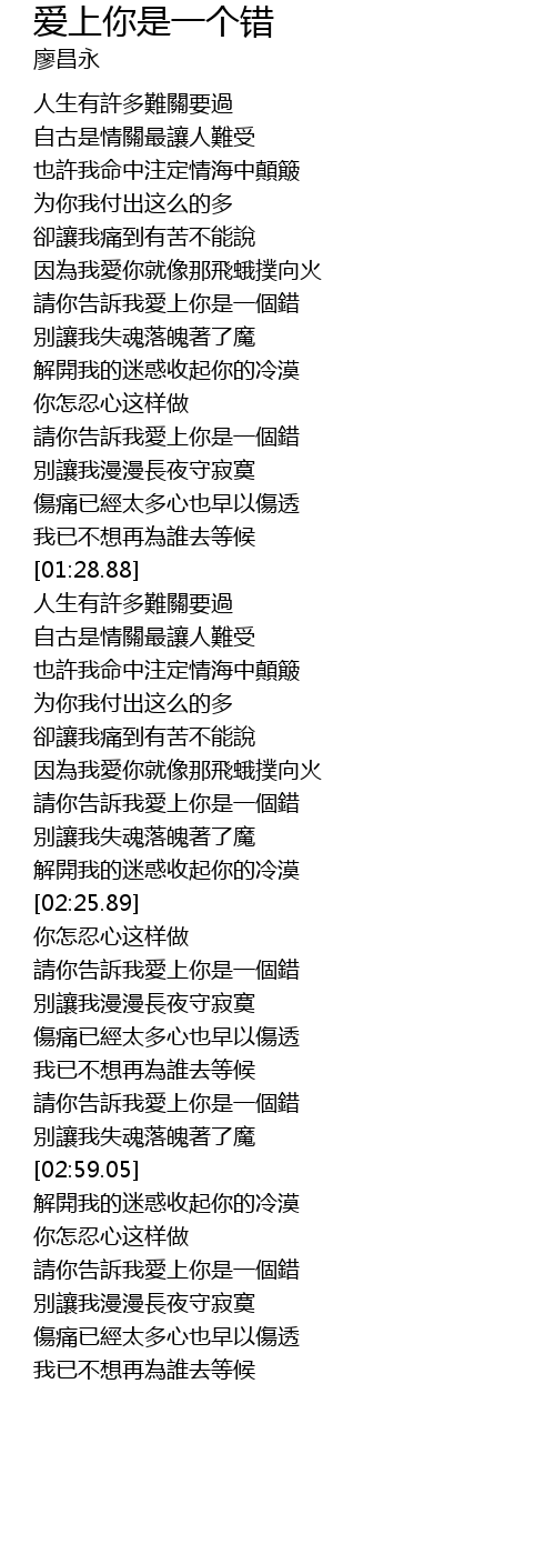 | [00:51.53] | 請你告訴我愛上你是一個錯 |