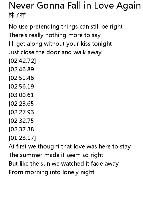 | [03:14.38][02:32.75][01:13.55] | Never gonna fall in love again |