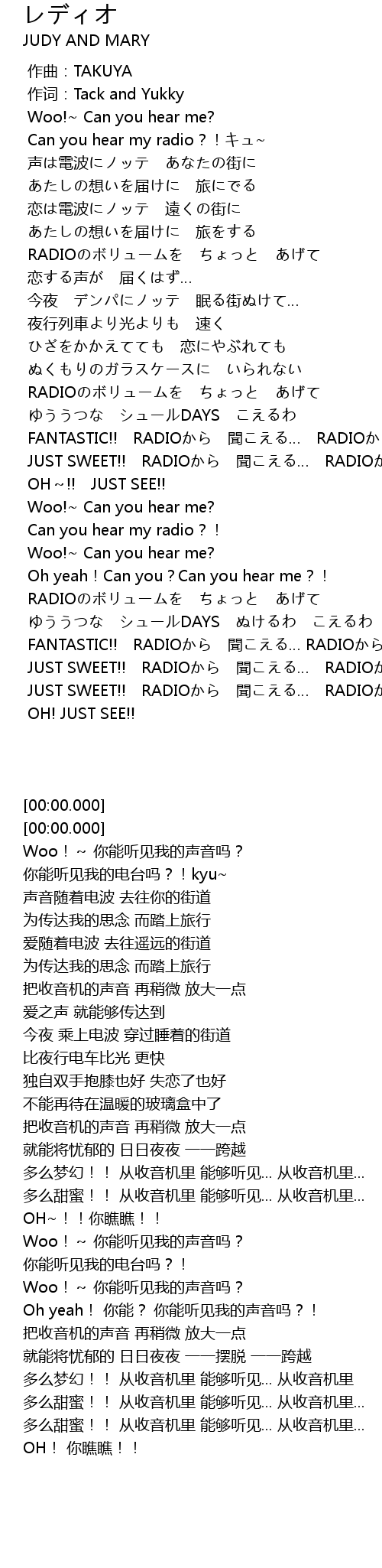 | [01:38.167] | FANTASTIC!! RADIOから 聞こえる… RADIOから… |