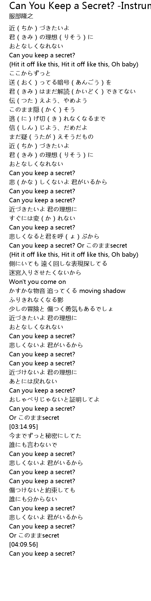 | [01:37.85] | Can you keep a secret? Or このままsecret |