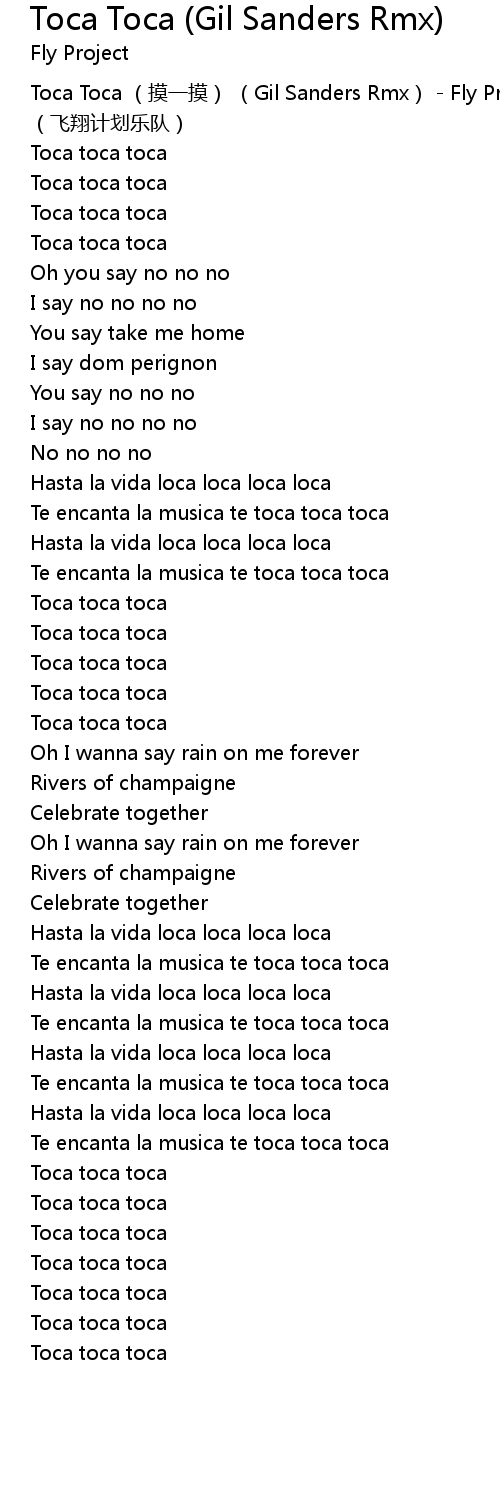 | [00:00.709] | Toca Toca (摸一摸) (Gil Sanders Rmx) - Fly Project (飞翔计划乐队) |