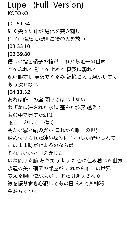| [03:02.09] | このまま時が止まるのならば それもいいと目を閉じた |