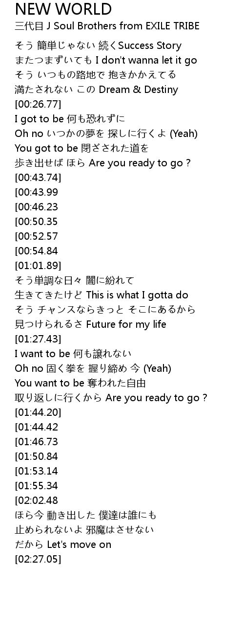 | [02:27.68][00:43.99] | Hey! Keep it going to the new the world |