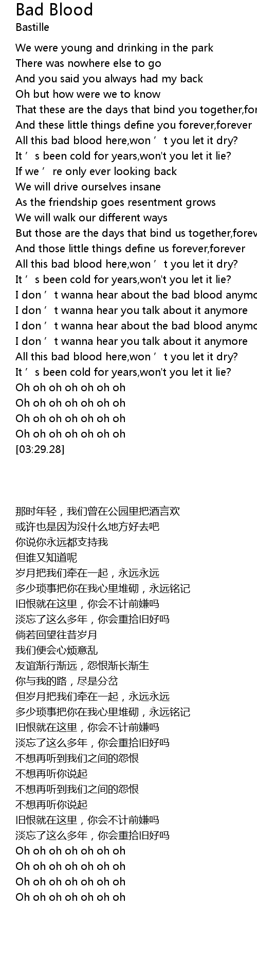 | [02:33.35] | I don ’t wanna hear about the bad blood anymore |