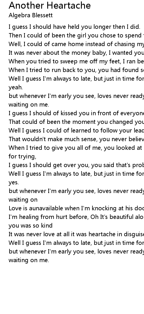 but whenever I'm early you see, loves never ready, but another heartaches waiting on |