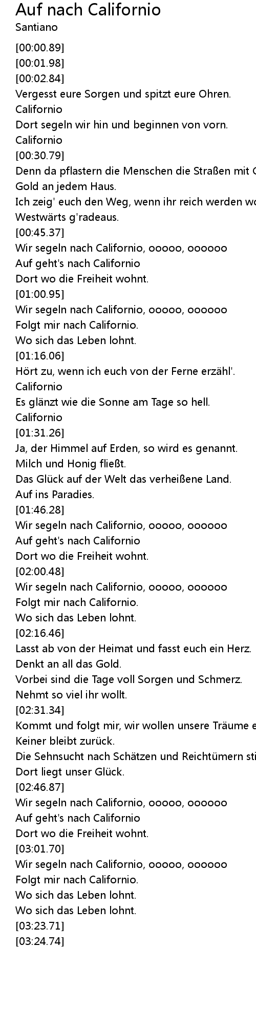 | [02:01.73] | Wir segeln nach Californio, ooooo, oooooo |