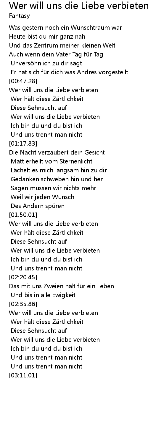 | [01:51.12] | Wer will uns die Liebe verbieten |