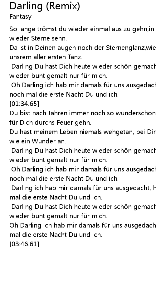 | [03:16.17] | Darling Du hast Dich heute wieder sch n gemacht, und Deine Augen wieder bunt gemalt nur fü r mich. |
