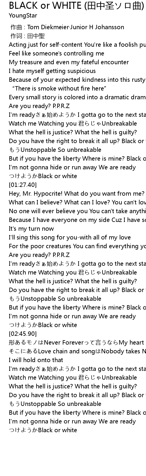 | [02:33.30] | But if you have the liberty Where is mine? Black or white |