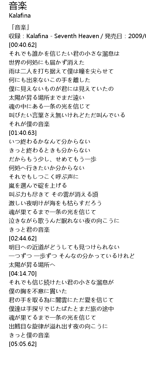 | [00:04.00] | 収録:Kalafina - Seventh Heaven/発売日:2009/03/04 |