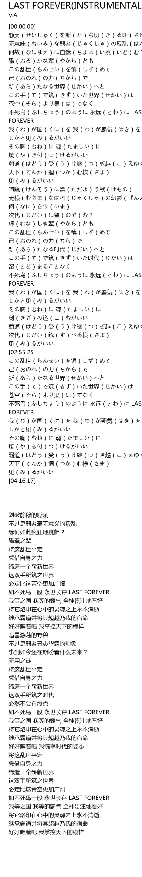 | [02:24.21] | 不死鸟(ふしちょう)のように 永远(とわ)に LAST FOREVER |