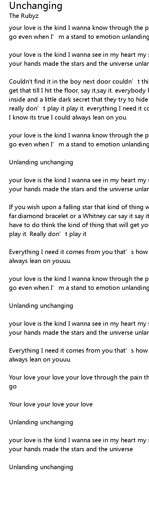 | your love is the kind I wanna know through the pain and the tears won' t let me go even when I' m a stand to emotion unlanding unchanging. | |