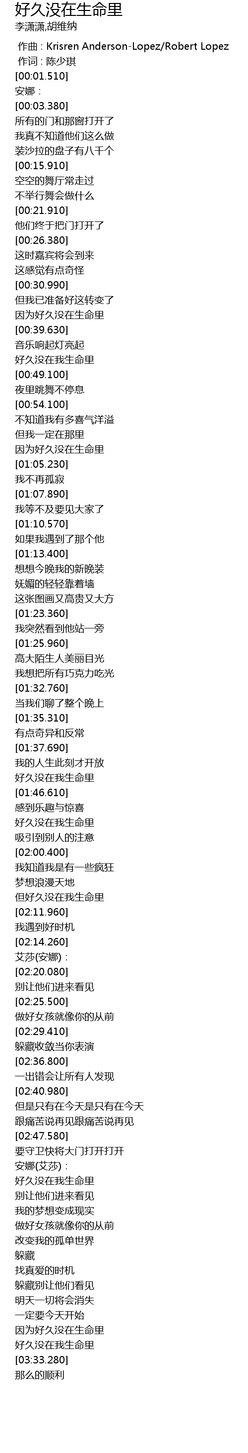 | [00:00.00] | zuo qu : Krisren AndersonLopez Robert Lopez |