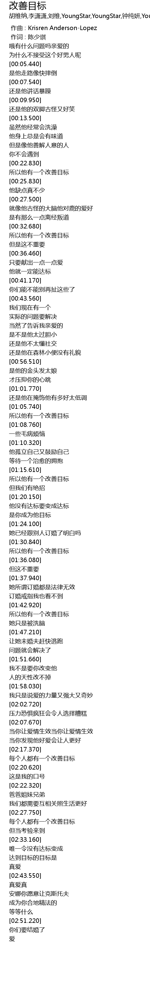 | [02:18.680] | mei ge ren dou you yi ge gai shan mu biao |