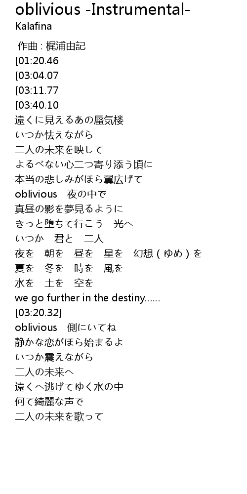 | [00:27.00][01:20.46][02:03.31][02:51.98][04:00.79] | Kalafina-oblivious |