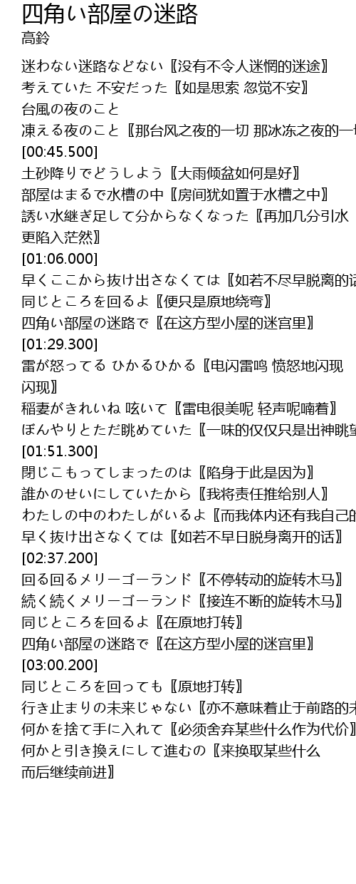 | [01:23.580] | 四角い部屋の迷路で〖在这方型小屋的迷宫里〗 |