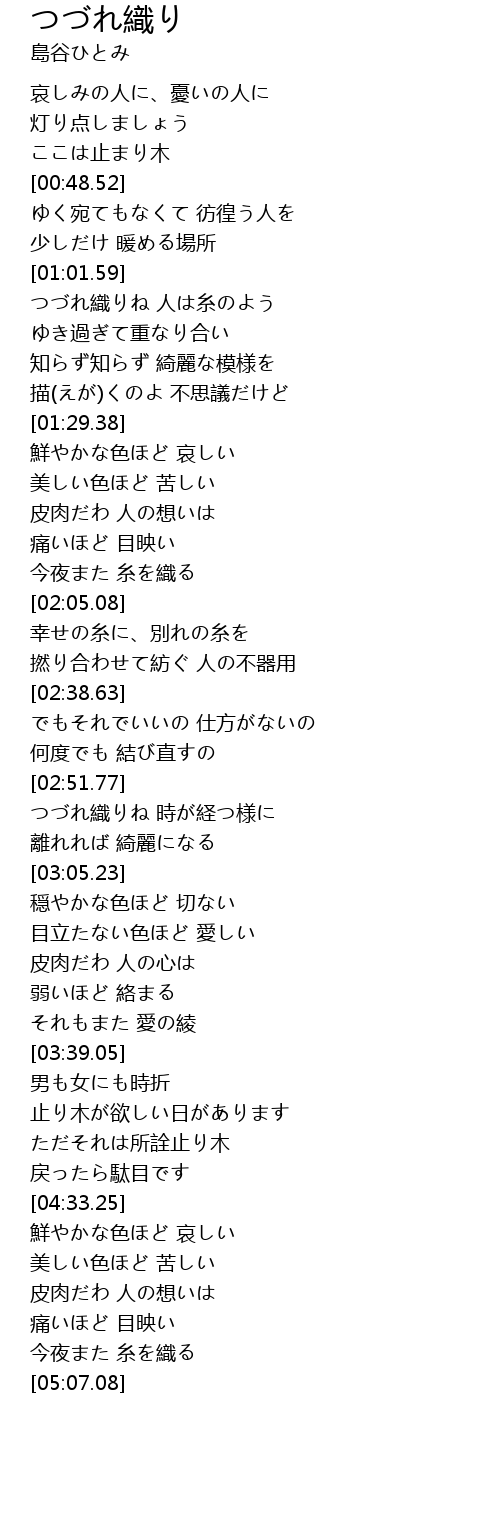 | [01:02.06] | つづれ織りね 人は糸のよう |
