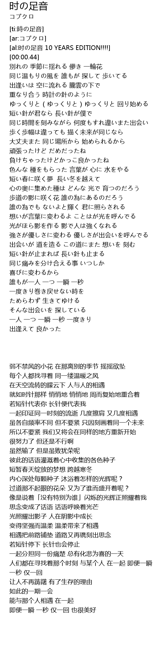 | [04:44.37] | 一人 一つ 一瞬 一秒 一度きり |