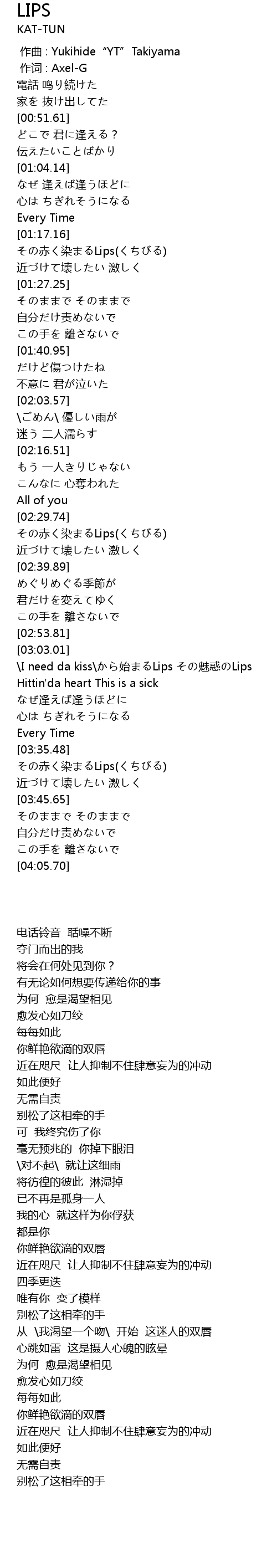 | [03:16.39] | I need da kiss shǐ Lips mèi huò Lips |