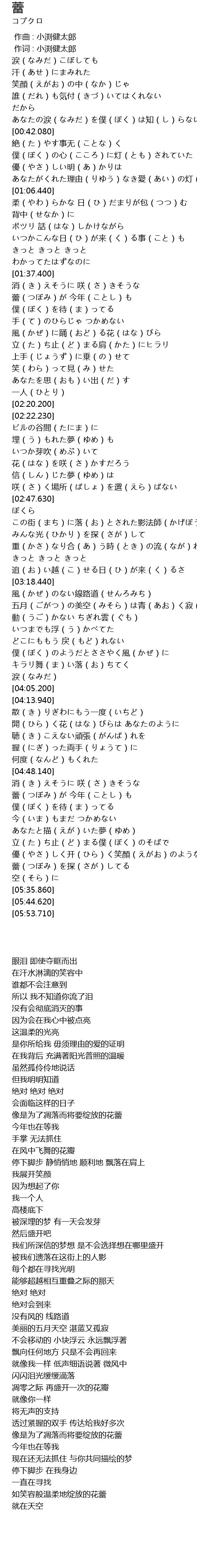 | [01:44.420] | 蕾(つぼみ)が 今年(ことし)も 僕(ぼく)を待(ま)ってる |