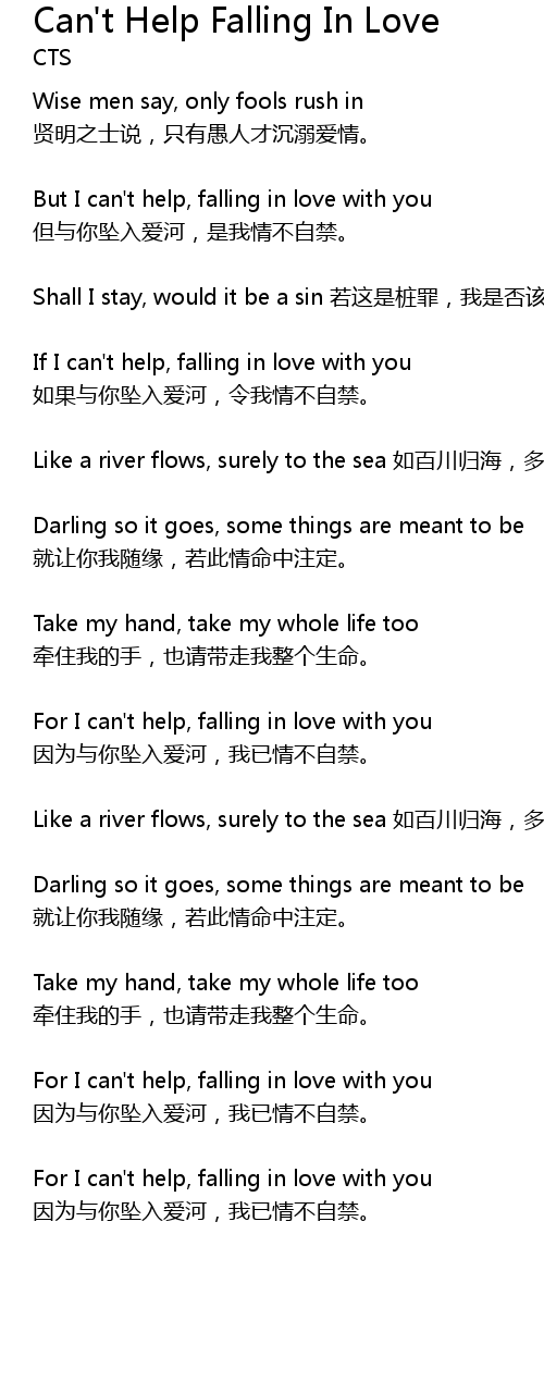 | For I can't help, falling in love with you 因为与你坠入爱河,我已情不自禁。 |