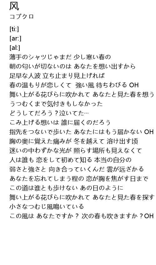 | [01:06.87] | 春の温もりが恋しくて 強い風 待ちわびる OH |