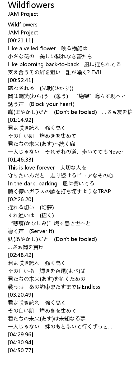 | [01:09.10] | 瞞(まやかし)だと (Don't be fooled) …さぁ友を信じて |