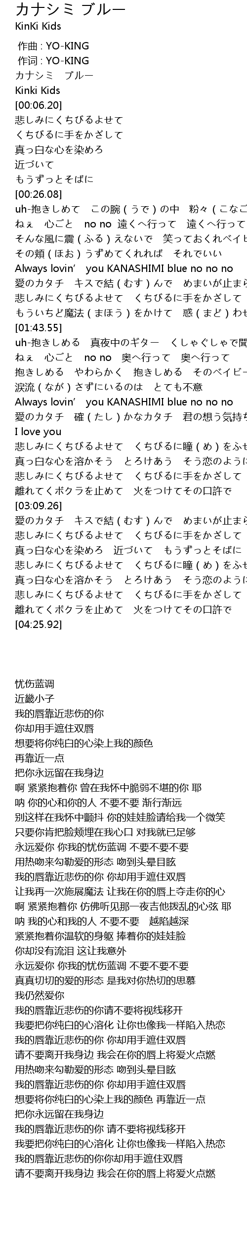 | [02:19.90] | Always lovin’ you KANASHIMI blue no no no |