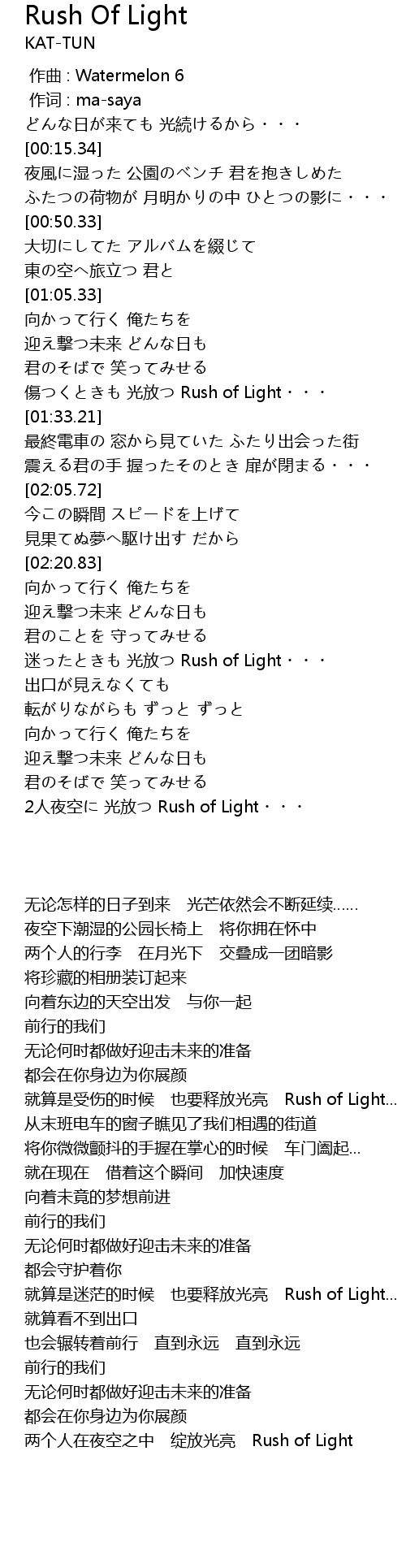 | [03:44.57] | 2人夜空に 光放つ Rush of Light・・・ |