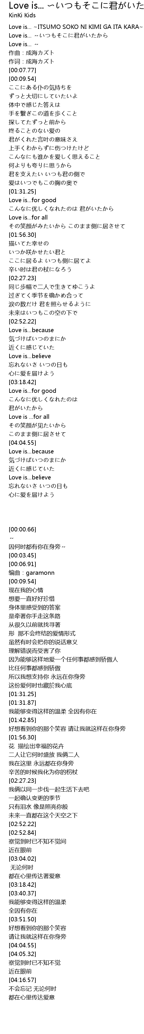 | [00:00.66] | Love is... ~ITSUMO SOKO NI KIMI GA ITA KARA~ |