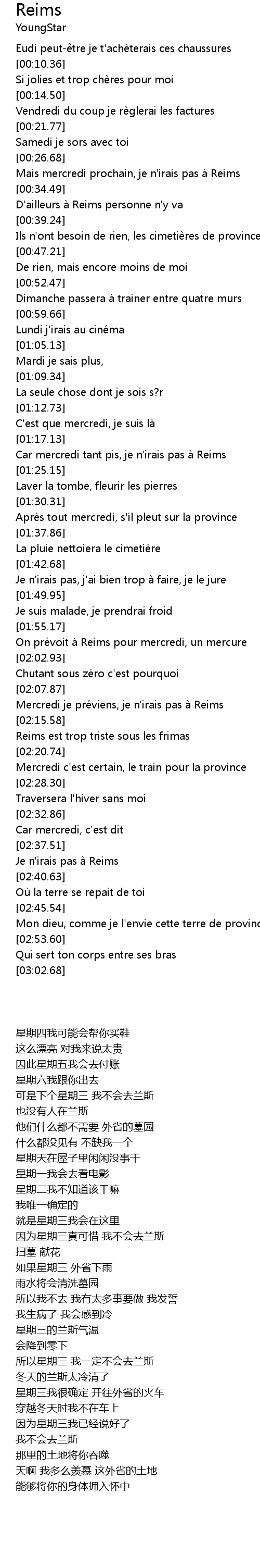 | [01:19.43] | Car mercredi tant pis, je n' irais pas a Reims |