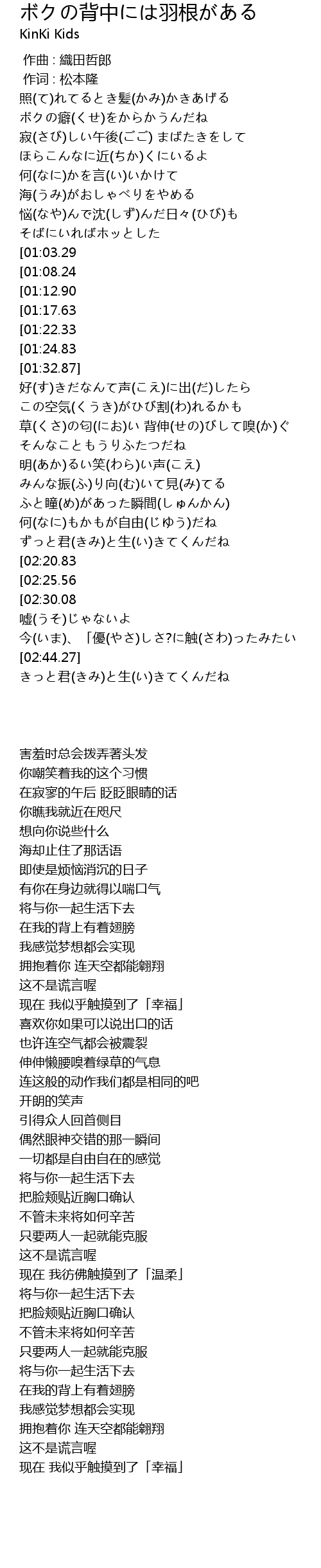 | [03:28.21][01:08.24] | ボクの背中(せなか)には羽根(はね)がある |